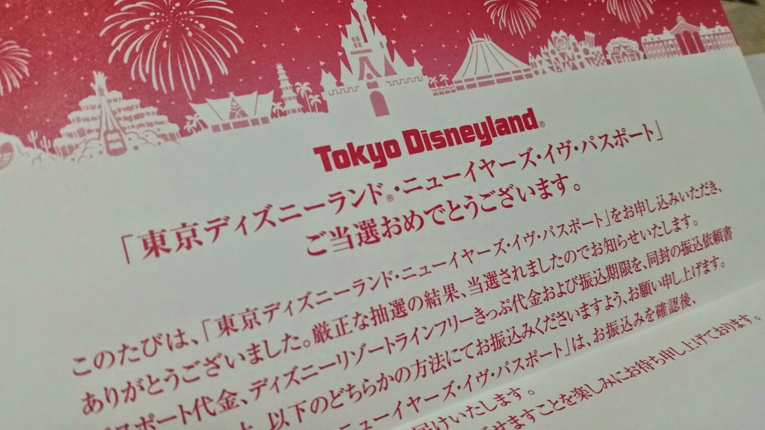 東京ディズニーランド・ニューイヤーズ・イヴ・パスポートの払込書がきました!イエーイ